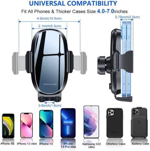 【UNIVERSAL COMPATIBILITY】Well-designed adjustable arms enable Miracase car cell phone holder fit with all phones (4.0-7.0 inches), thicker cases (Included Otterbox) and other devices (width between 2.1-4.0 inches), Compatible with iPhone 15/15 Pro/15 Pro Max/iPhone 14/14 Pro/13 Pro Max/ 13 Mini/12/11 Pro Max/11 Pro/11/XS MAX /XS/XR/X/Samsung Galaxy Note 20 / S21/ S21+/S20 +/ S20 Ultra/S10 +/Sony, LG, Google Pixel and all mobile phones, GPS devices