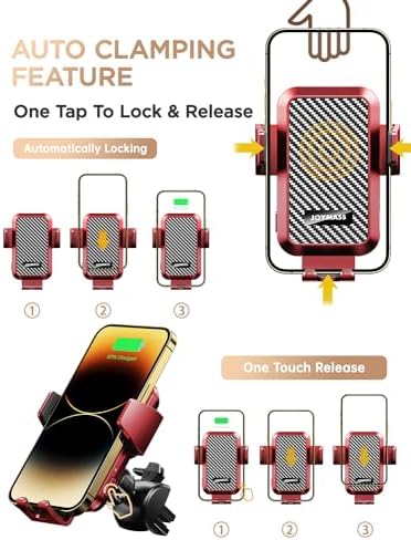 【AUTO CLAMPING FEATURE】Just put the phone in it, car phone holder mount wireless charging will automatically grips the phone and begins charging. Pressing either button on the side opens/closes it and as an added benefit the wireless charger for car will still open even after turning off the car